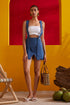 A chic take on the warm season, shop our textured Alacia Denim skirt that comes with suspenders and a front slit.