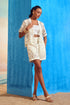 A playful co-ord set featuring a loose-fit Schiffli jacket paired with a feminine bustier and knee-length straight-fit shorts, perfect for a stylish, summer-inspired look with a touch of ethereal charm.