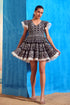 A playful layered Schiffli short dress featuring delicate ruffled sleeves, creating a sweet, whimsical silhouette perfect for a garden party or a summer soiree.