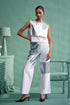 Steal the spotlight in our white denim and silver leather bib top , highlighted with gleaming silver rings and perfectly paired with denim and silver leather patchwork pants.
