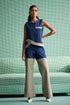 Unlock a new level of chic with this striking duo- A dark denim cut-sleeve top paired with beige checkered leather pants, for a unique interplay of colour and texture.