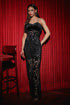 Black velvet with delicate floral cutwork and a sleek, full-length silhouette, this jumpsuit is the epitome of modern luxury.