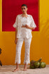 Striking summer style done right with our three piece Cabana Co-ord Set. It comes consisting a lace applique crop top, semi-lined Schiffli flared pant and an open jacket with delicate lace bell sleeves.