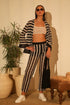 Discover the ease of destination dressing with our knitwear set of three featuring a cutwork bandeau with high waist straight pants and a full sleeves open jacket with black raffia detailing.