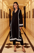 A breathable cotton cambric black long kurta paired with straight pants, the set features intricate lace detailing that is complemented by a breezy silhouette.