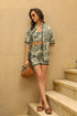 Designed to whisk you away to sandy shores and picturesque promenades, this three piece set in the Toile de Jouy print features a crop top, high waist shorts and an open jacket with rick rack lace trimming.